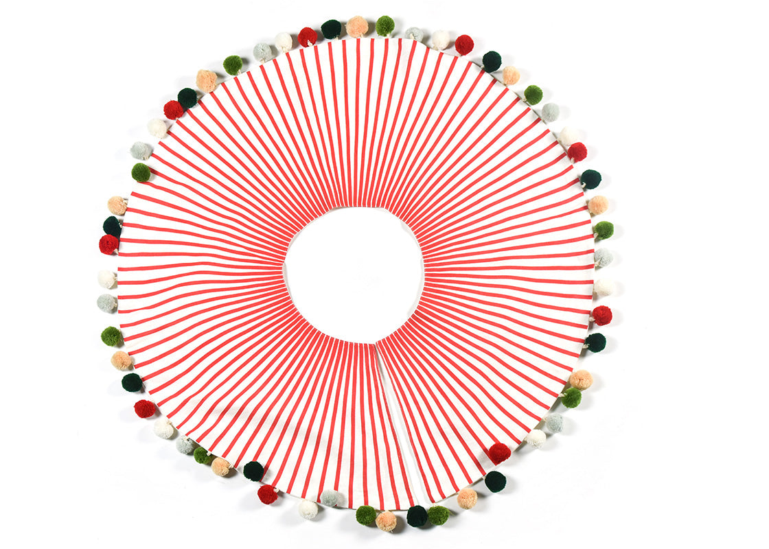 Red Stripe Tree Skirt With Pom Poms