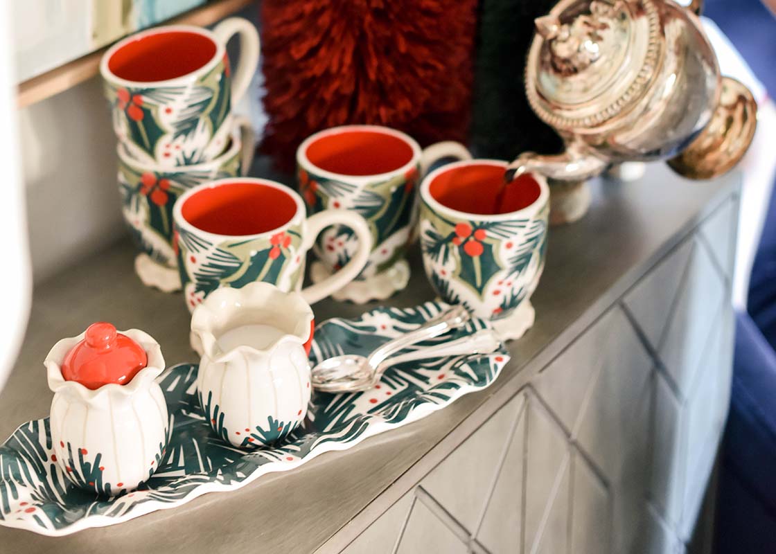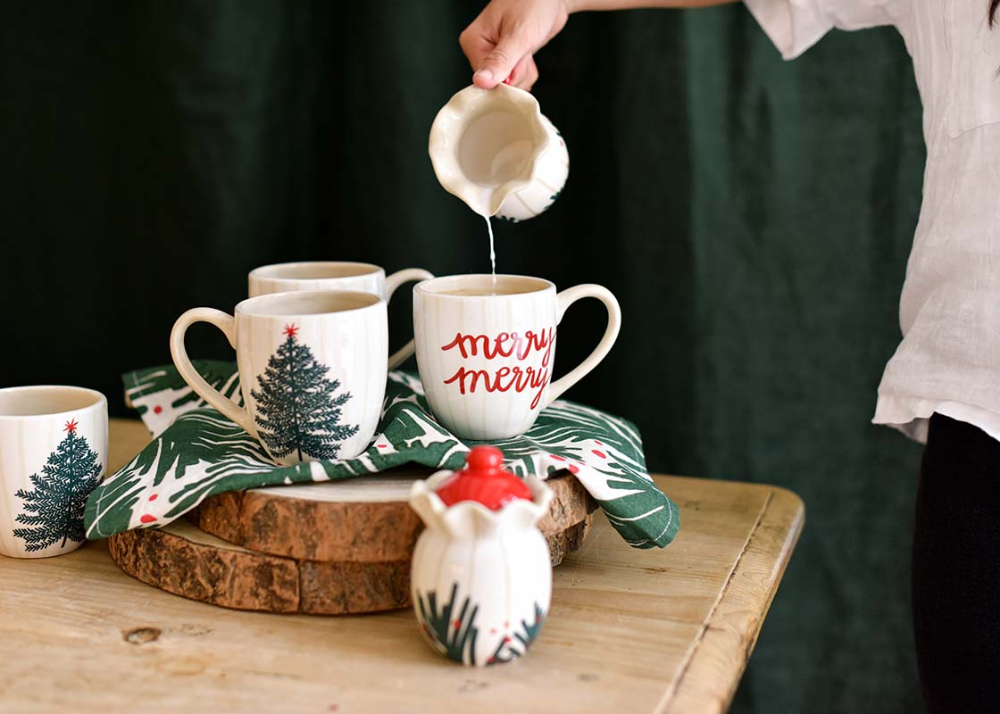 Add some holiday spirit to your morning coffee with the Balsam and Berry Ruffle Cream and Sugar Set from Coton Colors.
