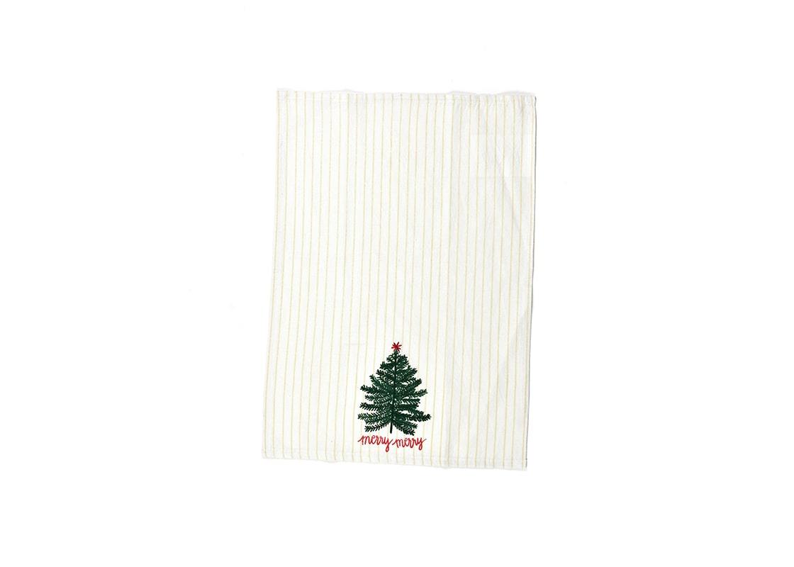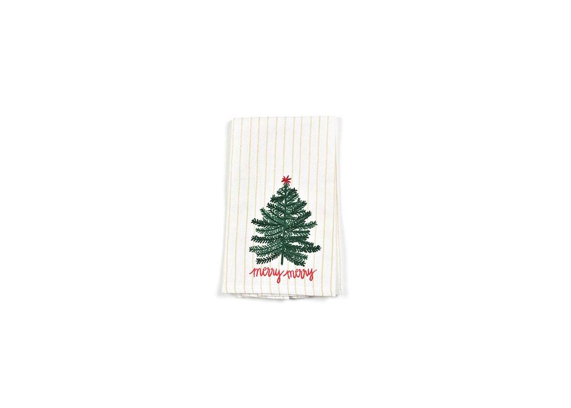 Wash up in style with our Balsam and Berry Tree Small Hand Towel. During the holiday season, decorate the oven handle or dry your hands with our linen hand towels. Our small linen holiday hand towel is adorned with thin golden yellow stripes and is embroidered with a green tree and red scripted, “Merry Merry.”