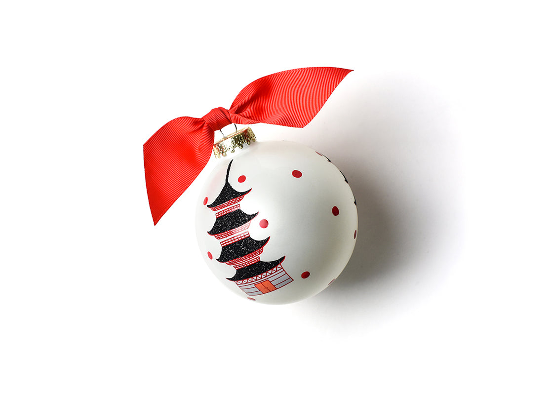 The white glass with red dots provides a simple background for the elegant hand-drawn details of a traditional Chinese pagoda, and the festive red bow on top ties the look together. Treasure this Chinese Pagoda Glass Ornament in your home or personalize it for a thoughtful gift.