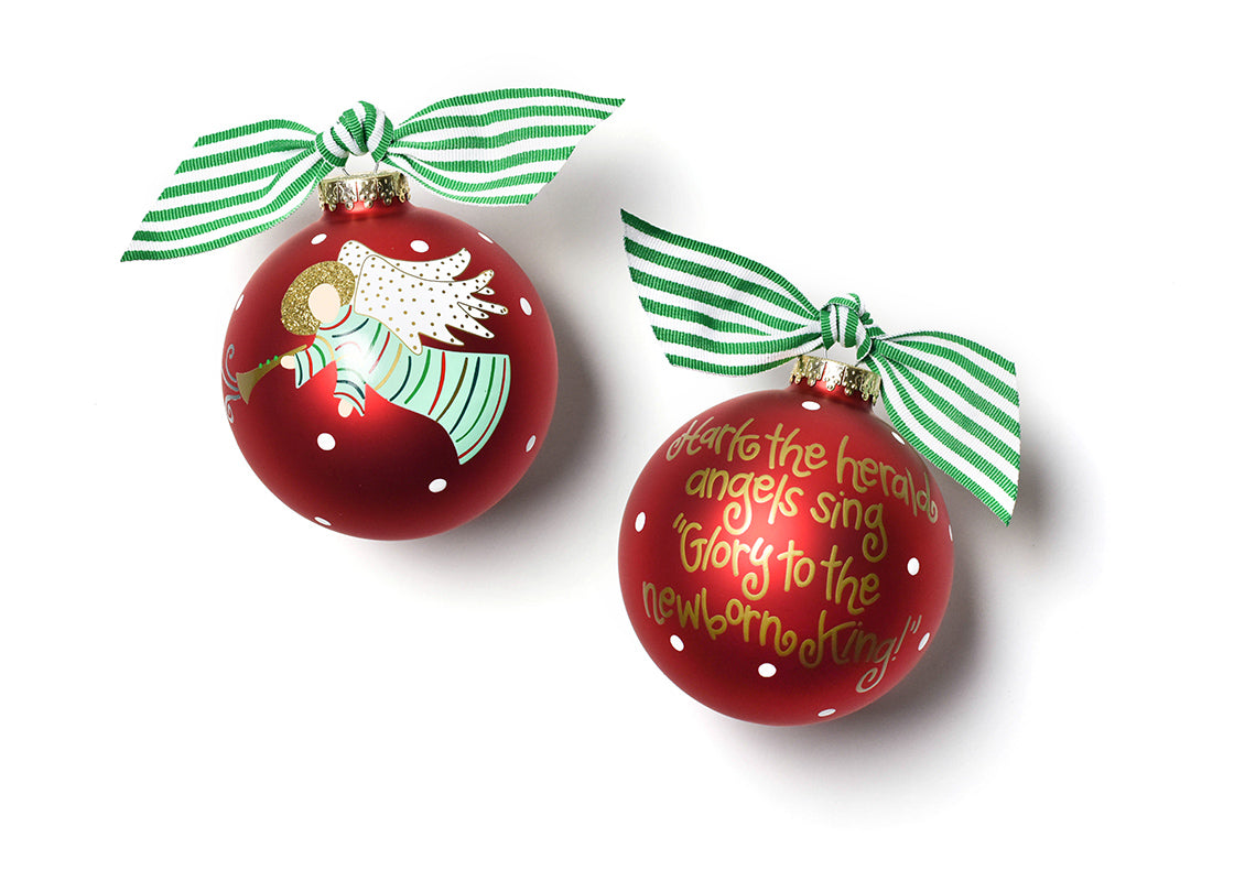 Each ornament features a hand-drawn illustration of a classic angel and a verse from the iconic Christmas hymn on a bold red background with a green and white ribbon accent. No matter how you choose to display it, this ornament will become a meaningful piece of your holiday traditions for years to come.