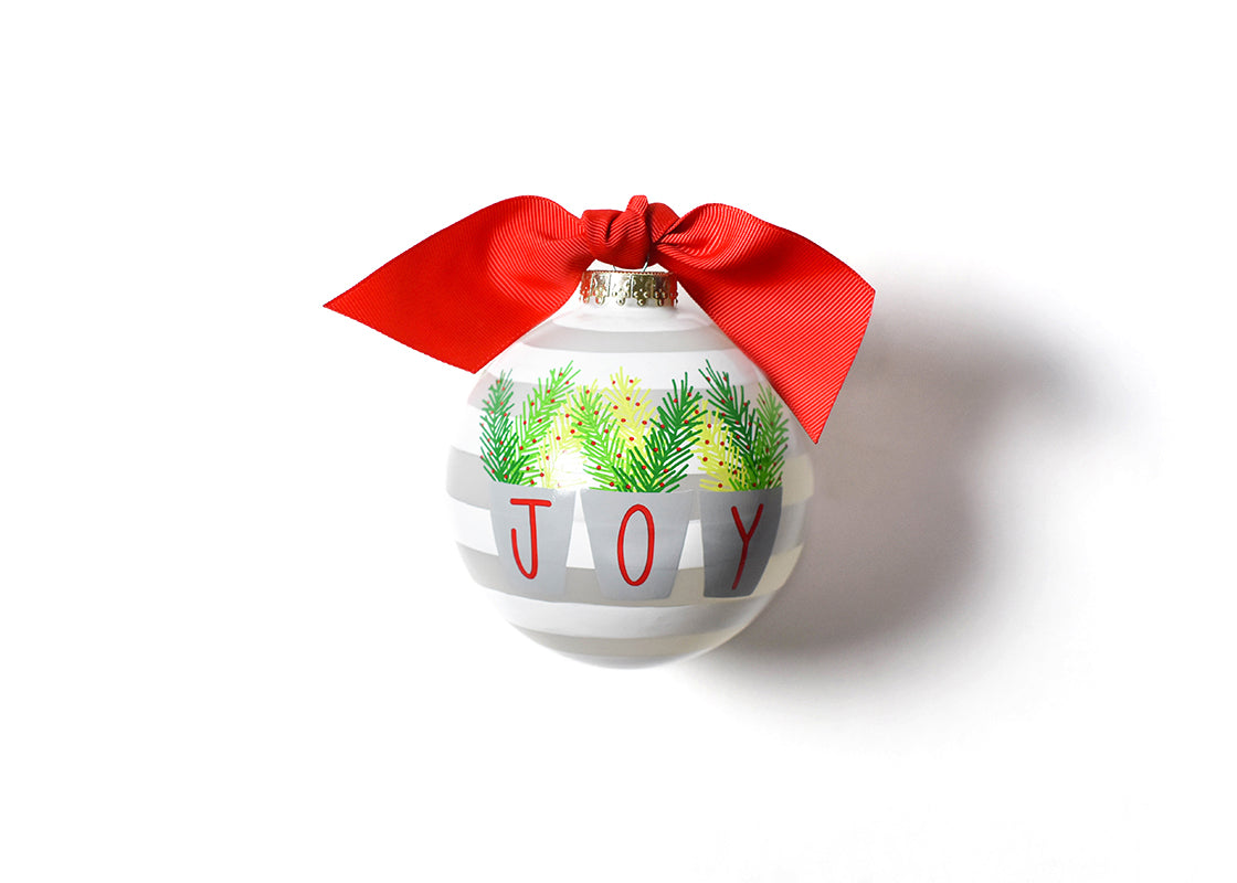 Our Joy Branches Ornament features a neutral background of white stripes, three hand-illustrated pots filled with seasonal greenery, and a coordinating red ribbon. The traditional colors paired with the vibrant design make this ornament one of our favorites for gifting to the plant lovers in your life.