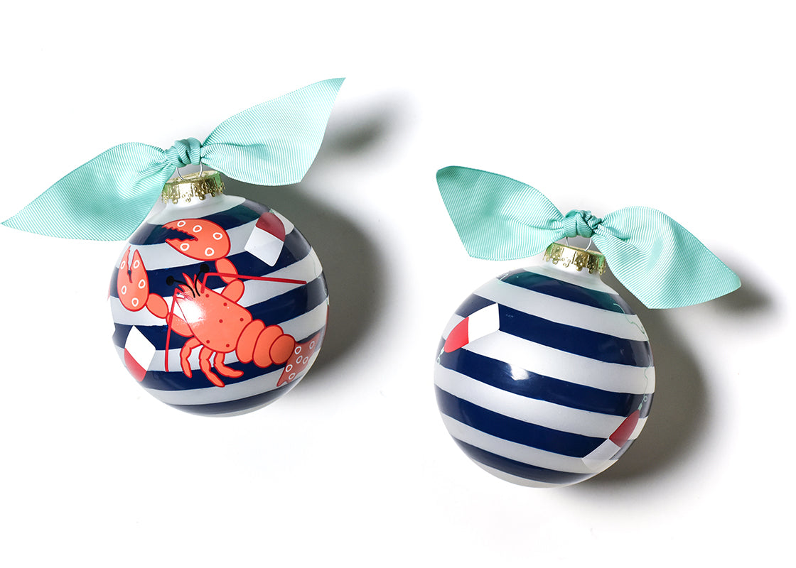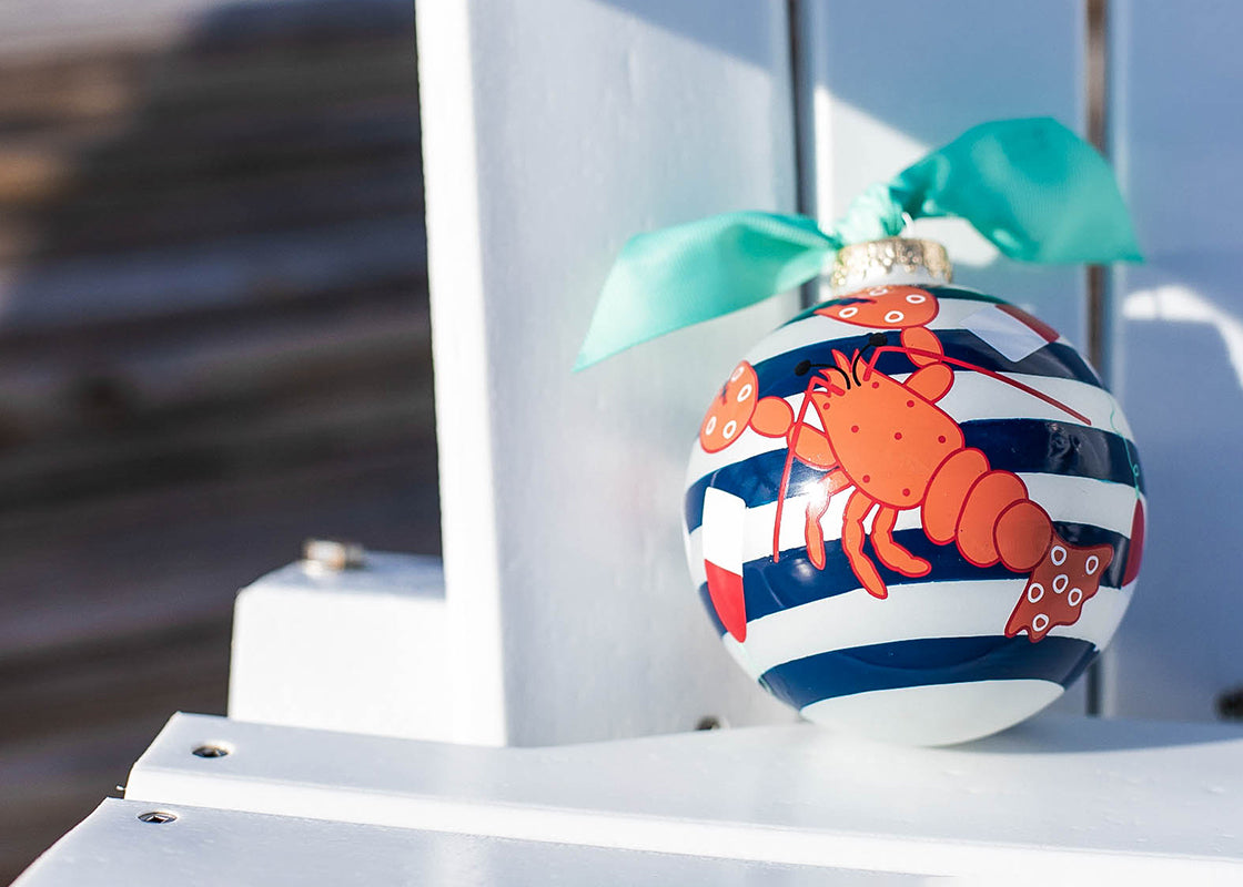This ornament features a nautical color palette of navy and white, red and white buoys, and an adorable peach lobster topped with a light blue ribbon. No matter the occasion, this design makes it easy to celebrate the moments that mean the most to you.