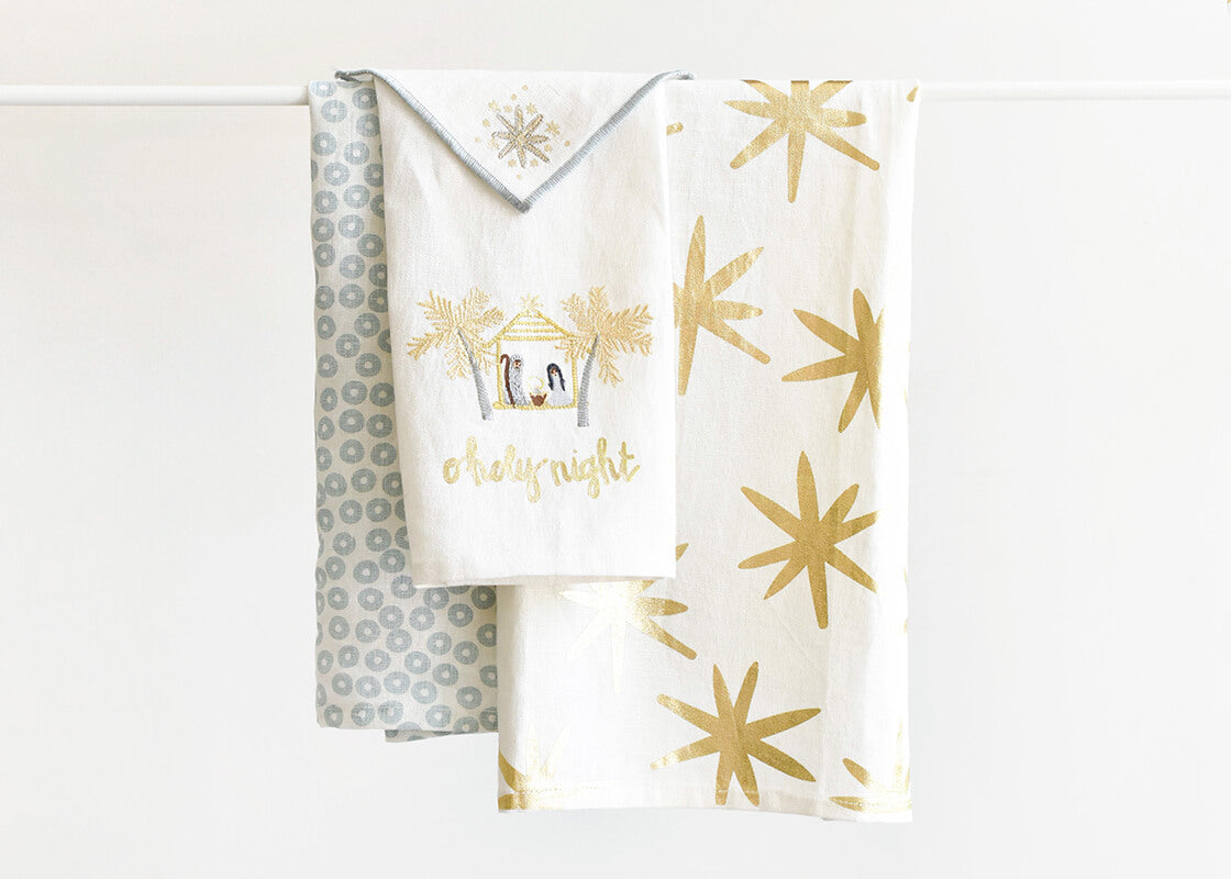 Featuring a double-sided embroidered illustration of the nativity scene of Mary, Joseph, and baby Jesus surrounded by golden palms, add to your home for easy Christmas décor. Display this towel in your bathroom or layer it with other styles for a festive display in your kitchen.